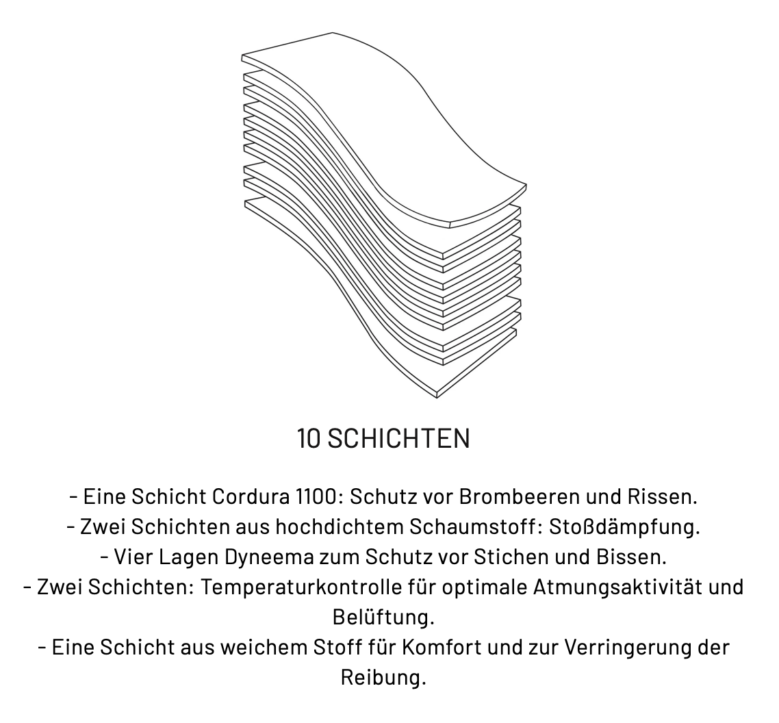 - Eine Lage Cordura 1100: Schutz gegen Dornengestrüpp und Risse,