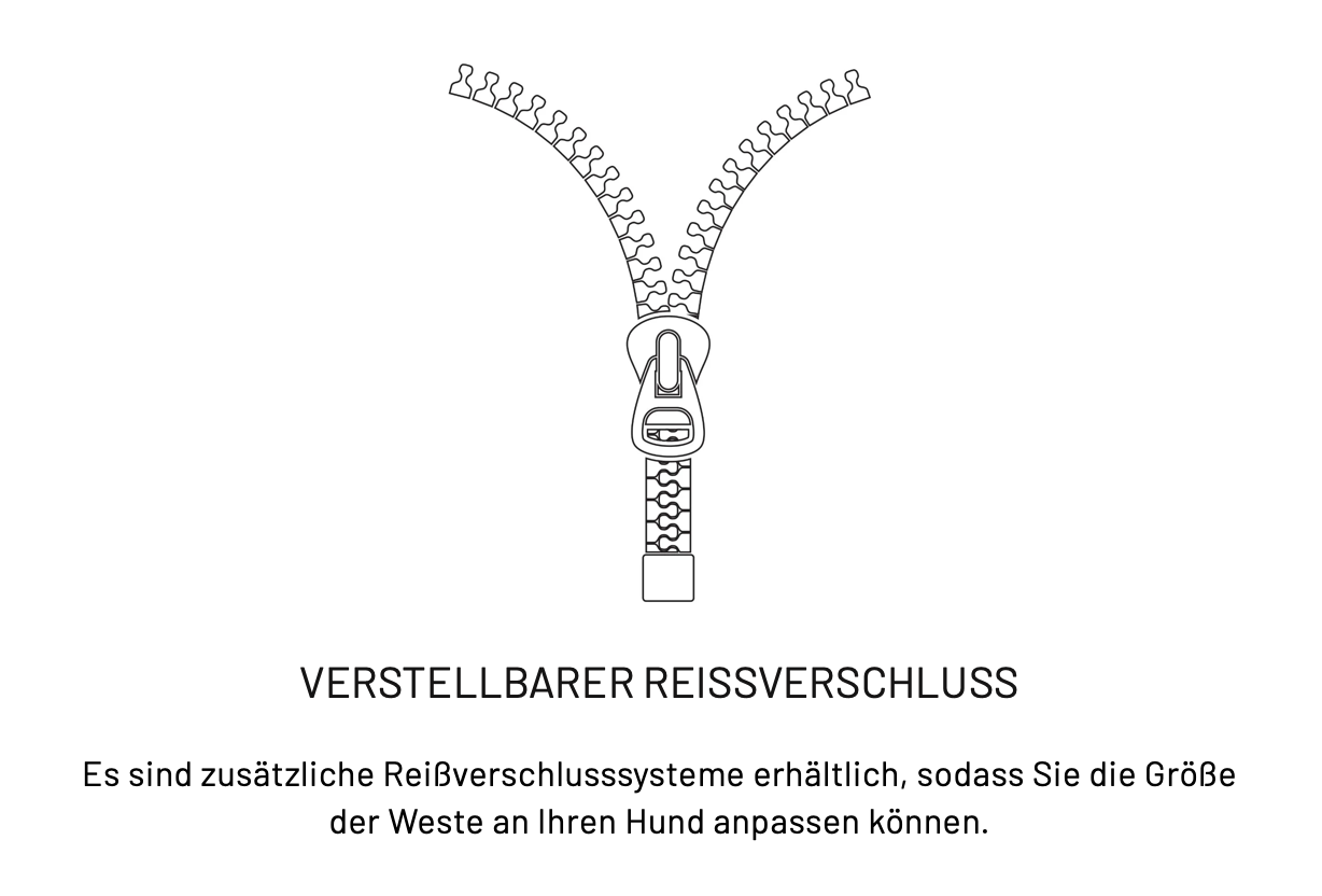 Die jeweilige Grösse lässt sich mit einem Reissverschluss-Zwischenteil von 3 cm regulieren (z.B. vor den Jagden mit Zwischenteil, während/nach den Jagden ohne Zwischenteil).