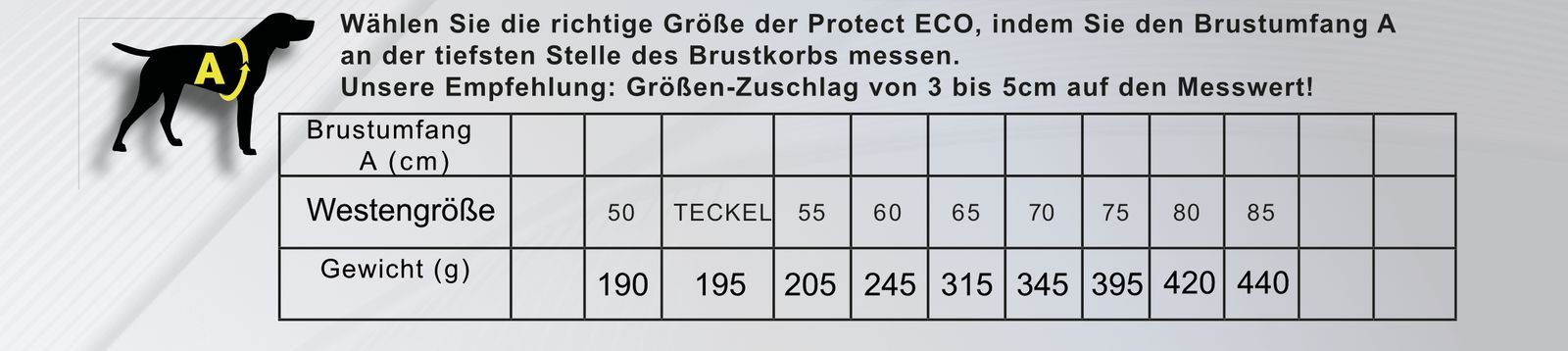 Bitte rechnen Sie vom gemessenen Brustumfang hinter den Vorderbeinen 5 cm dazu!