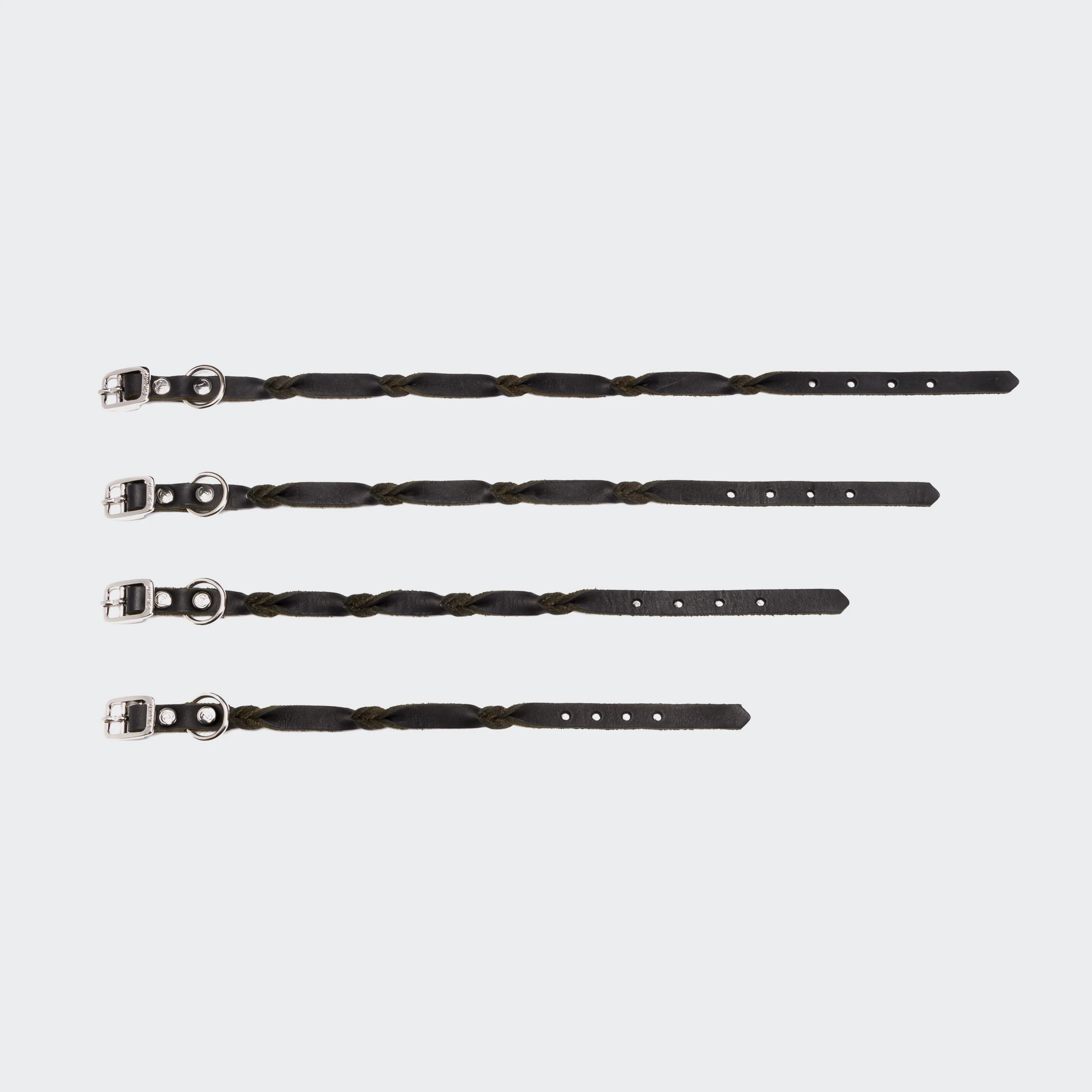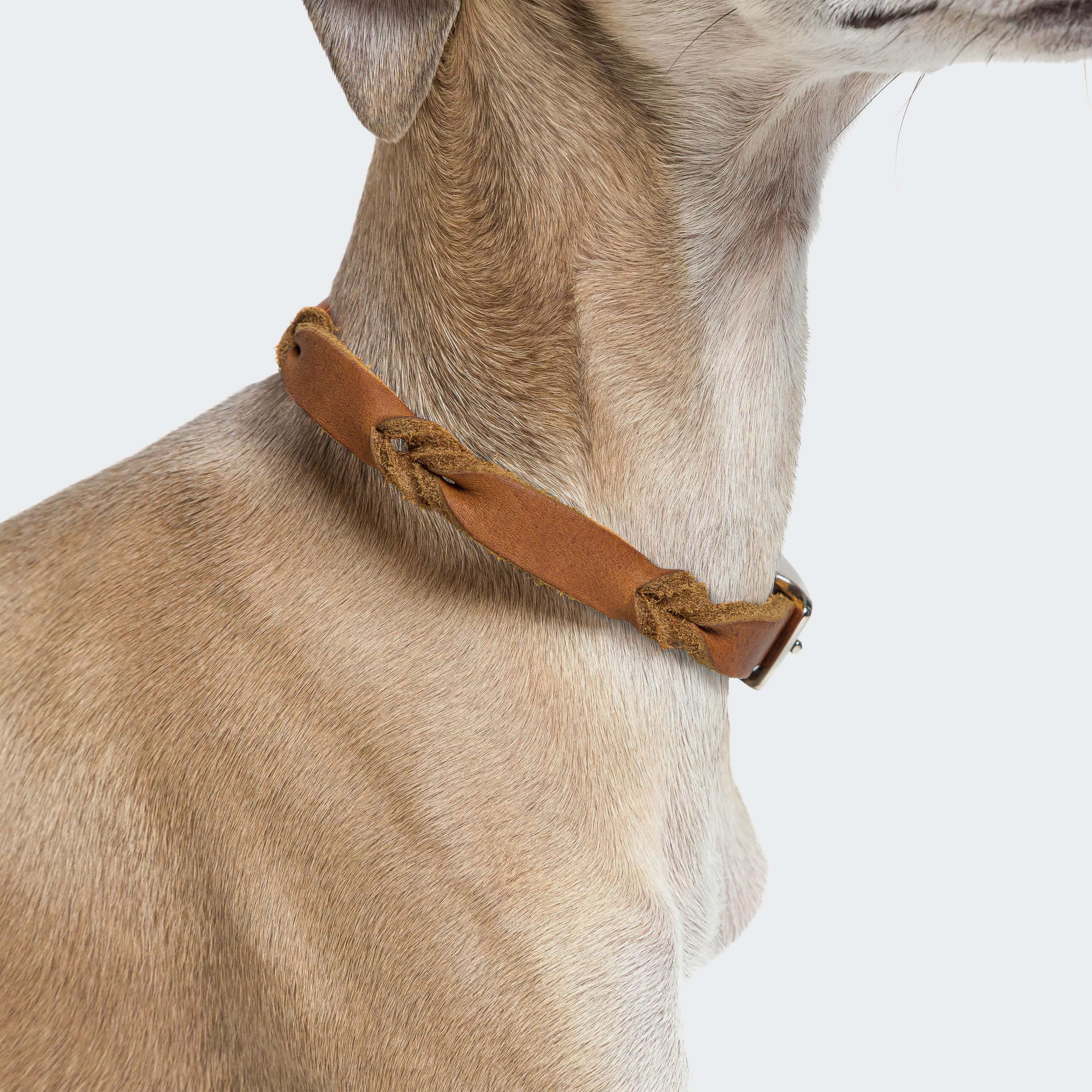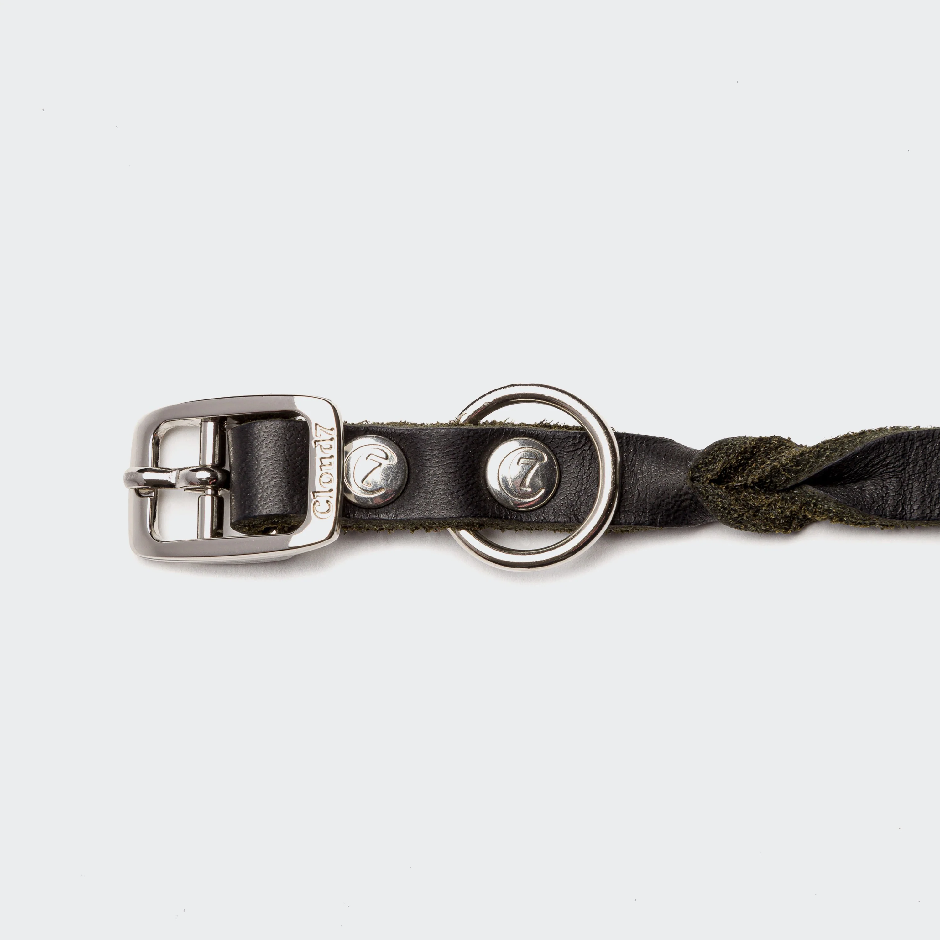 Besonders schmales Fettleder Hundehalsband für kleine Hunde mit geflochtenen Details in Schwarz mit Schließe und Nieten aus Edelstahl.
