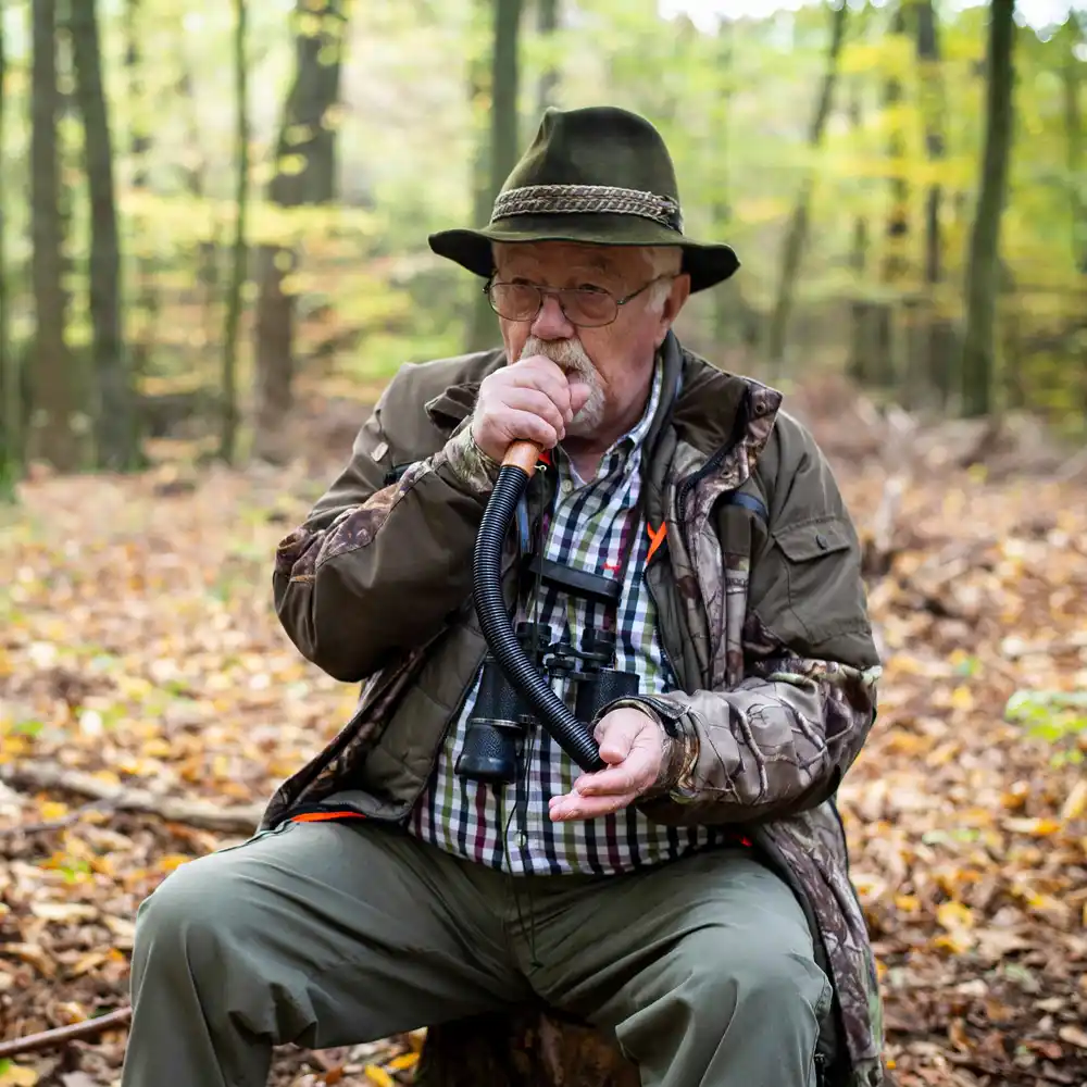 Man kann den rülpsenden Brunftruf des Damhirsches mit diesem Schwarzwildlocker nachahmen und ebenso das wütende Brummen des Kaffernbüffels.