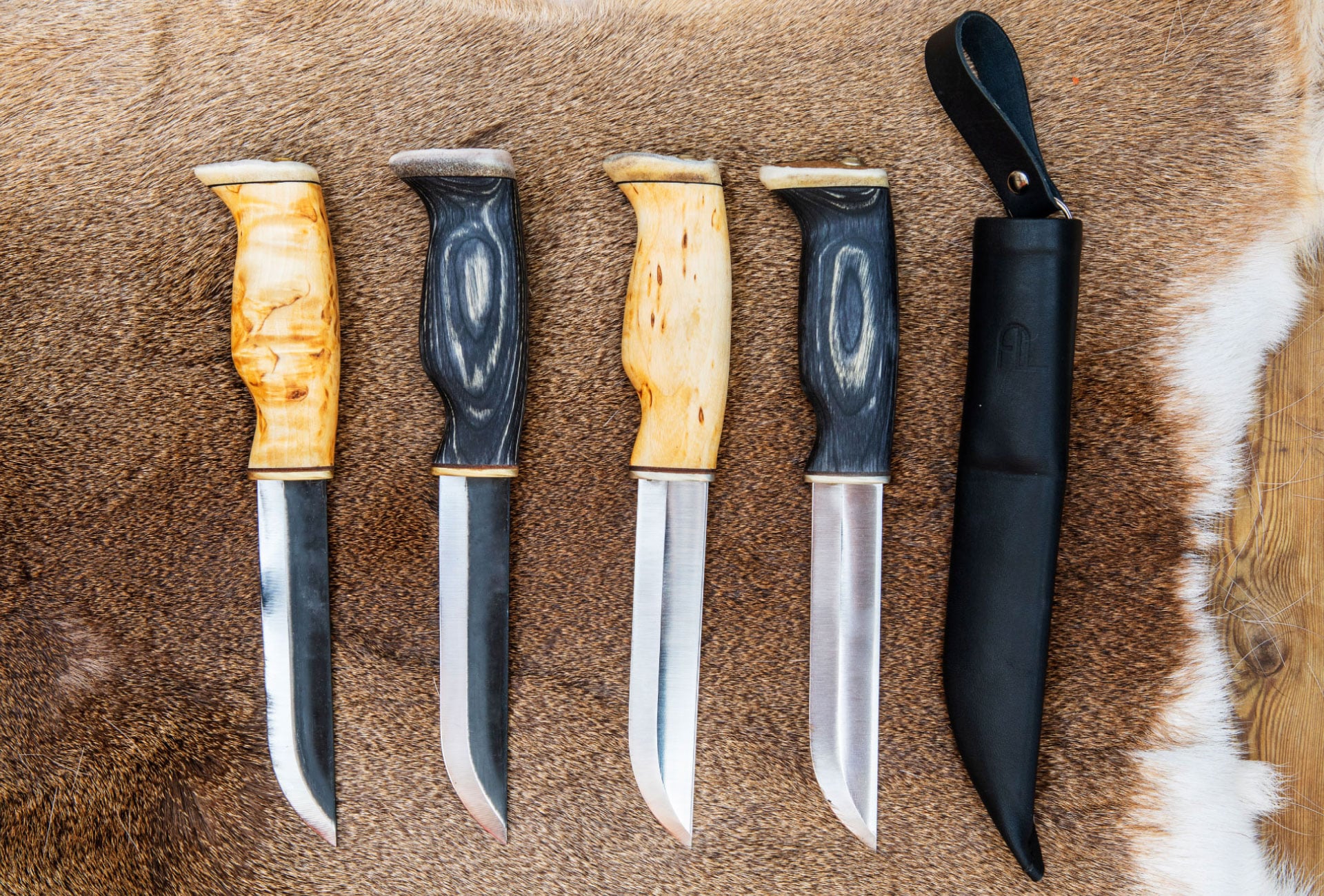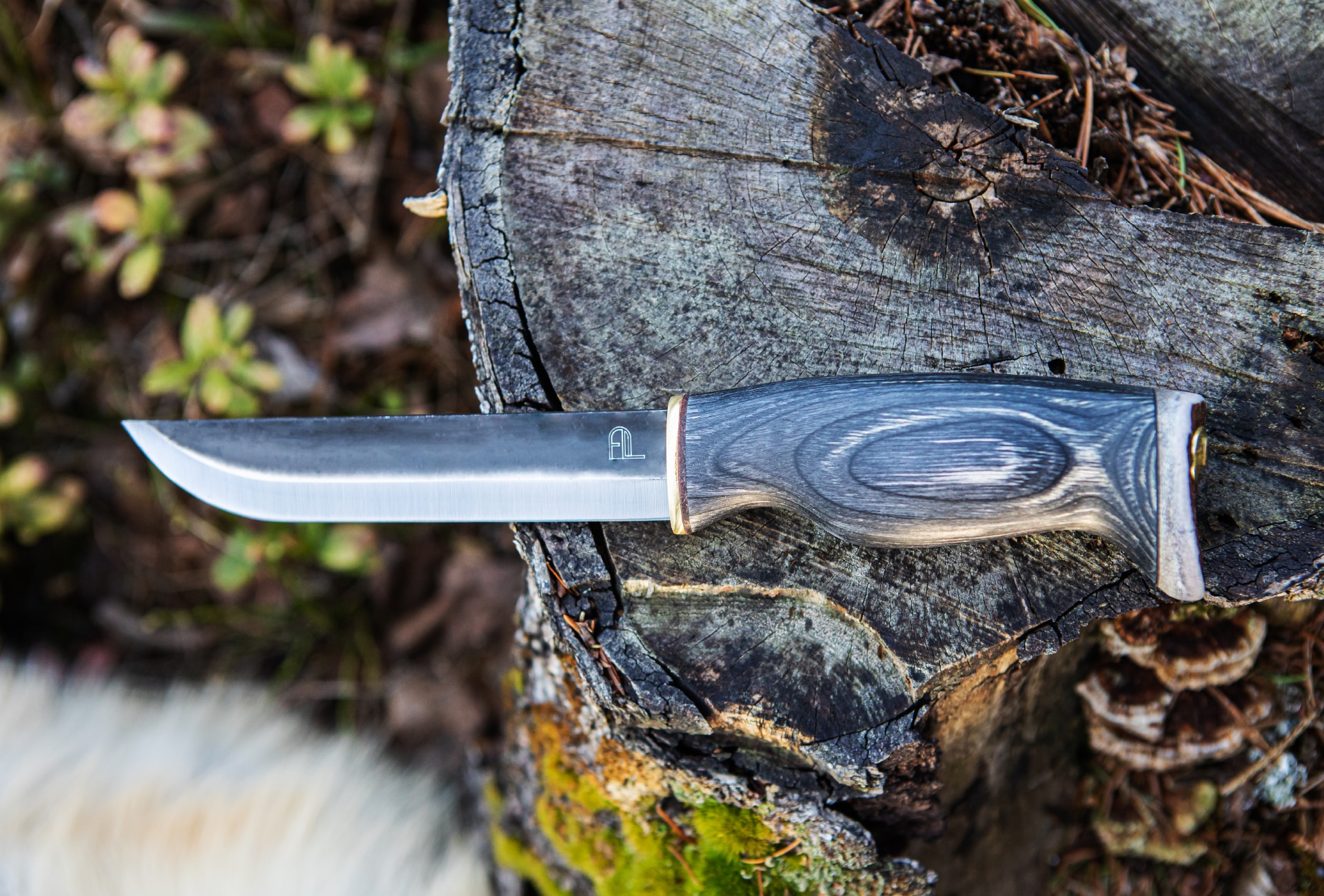 Griff aus Zirbelkiefer-Birke oder schwarz gedämpfter Birke mit Hirschhornknopf.