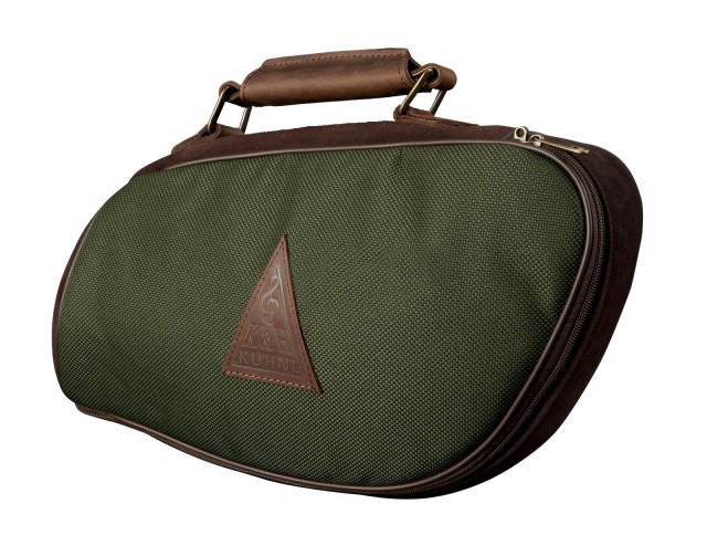 Hülle, grün aus strapazierfähigen wasserabweisenden Material, dicke Schaumstofffütterung, mit Lederapplikationen und Ledergriff, Innentasche für Mundstück mit Reißverschluss.