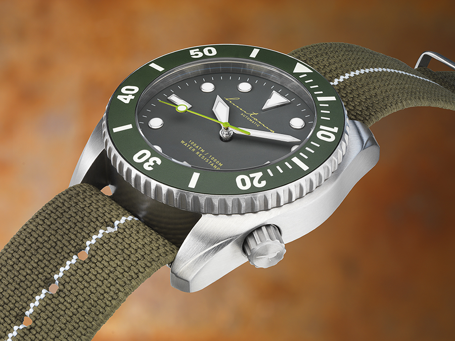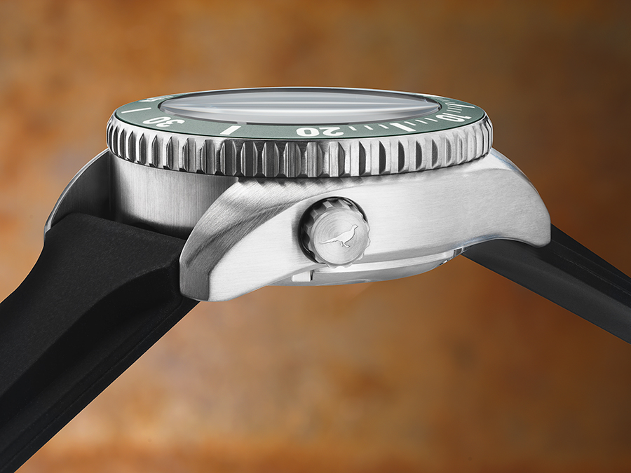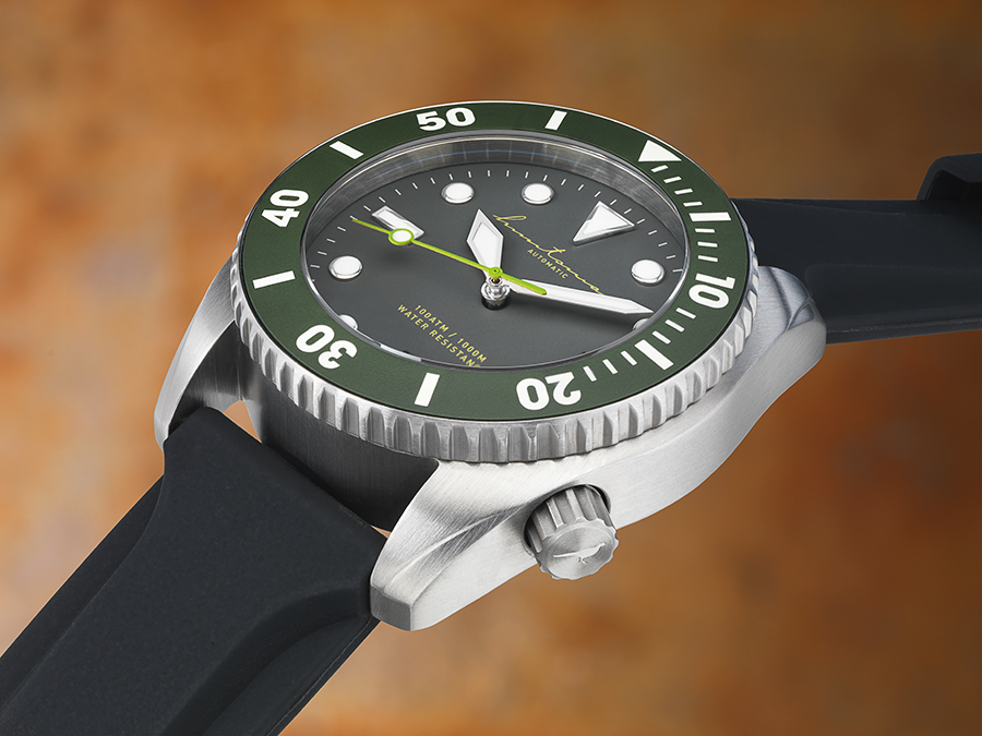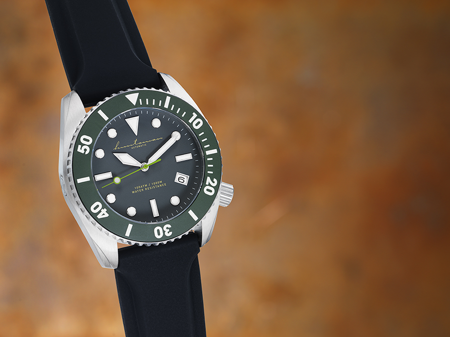 Die edle und erste Jagduhr von Laksen, die Huntsman E01/A mit passend grüner Lünette. Im Stil einer Rolex Seadweller mit Helium-Ventil wurde diese Uhr exklusiv für Laksen von der Dänischen Design-Agentur Bønnelycke mdd entwickelt.