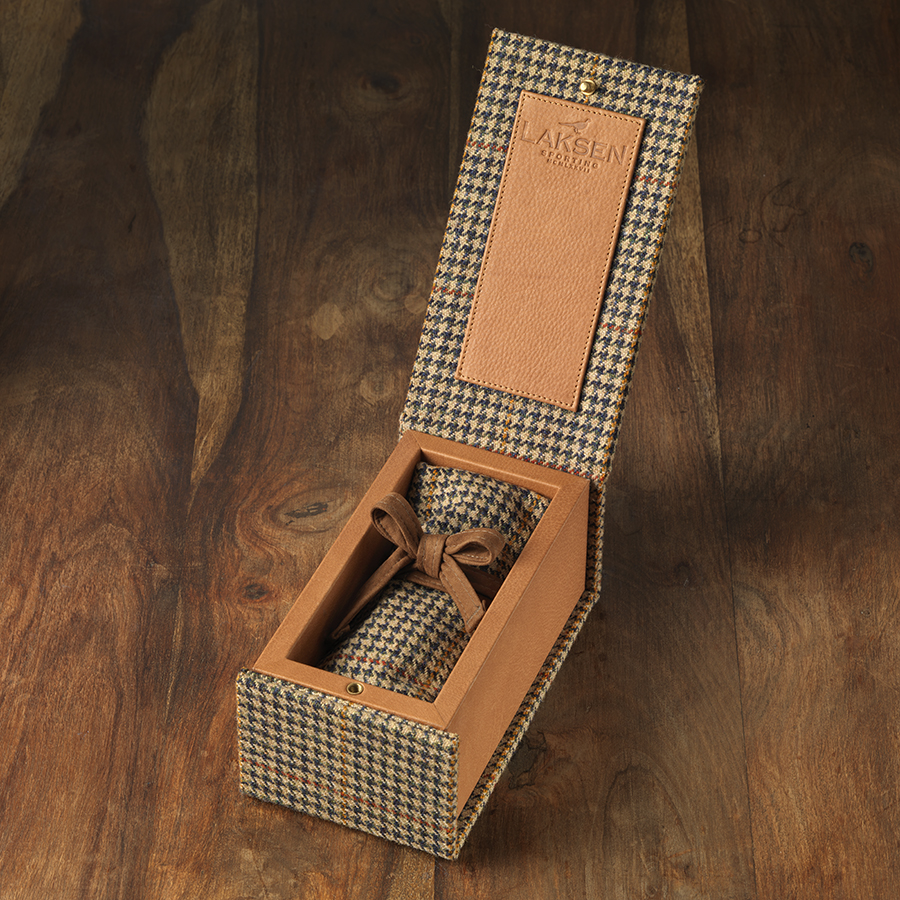 Die Huntsman-Uhrenbox ist keine gewöhnliche Uhren-Box. Denn als Verweis auf das Erbe von Laksen Sporting, und der Huntsman die ein wahres Sportgerät ist, wurde schottischer Tweed verwendet und die feinsten Italienisches Leder zu einer einmaligen, handgefertigten Uhren-Box. Laksen ist zu diesem Zweck eine Partnerschaft mit dem dänischen Unternehmen August Sandgren eingegangen, das 1920 vom legendären Buchbinder und Schachtelhersteller August Sandgren gegründet wurde.