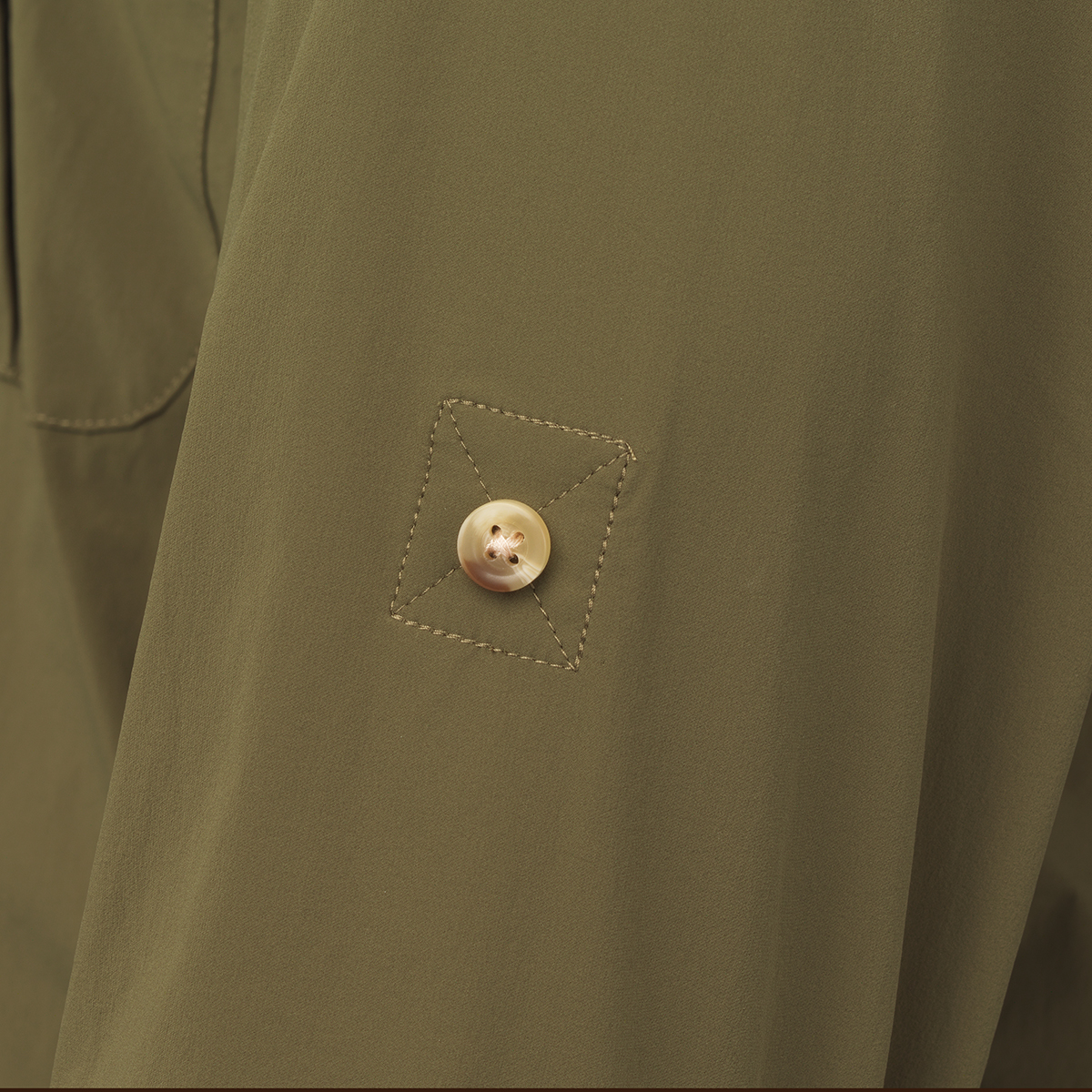 Es verfügt über eine Brusttasche und Träger zum Hochkrempeln der Ärmel.