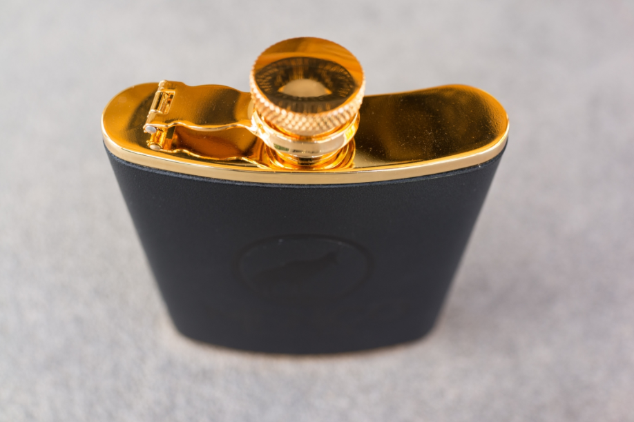 Wunderschöner, edler Flachmann in Jagdhorn-Gold. Ein treuer und edler Begleiter. Zur Verwendung als Trost nach Fehlschüssen, zum Feier von Erfolgen, zur Desinfektion von Wunden oder zum Abschmecken von Wildsaucen.