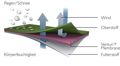 Absolut Wasserdicht. Venturi ist das exklusive Laminat von Schöffel. Die Hochleistungs-Membrane eignet sich perfekt für den Outdoor-Bereich durch hohenTragekomfort, absolute Wind- und Wasserdichtigkeit und Atmungsaktivität. Venturi ist eine geschlossene Membrane, durch die kein Wind bzw. Wasser dringen kann.